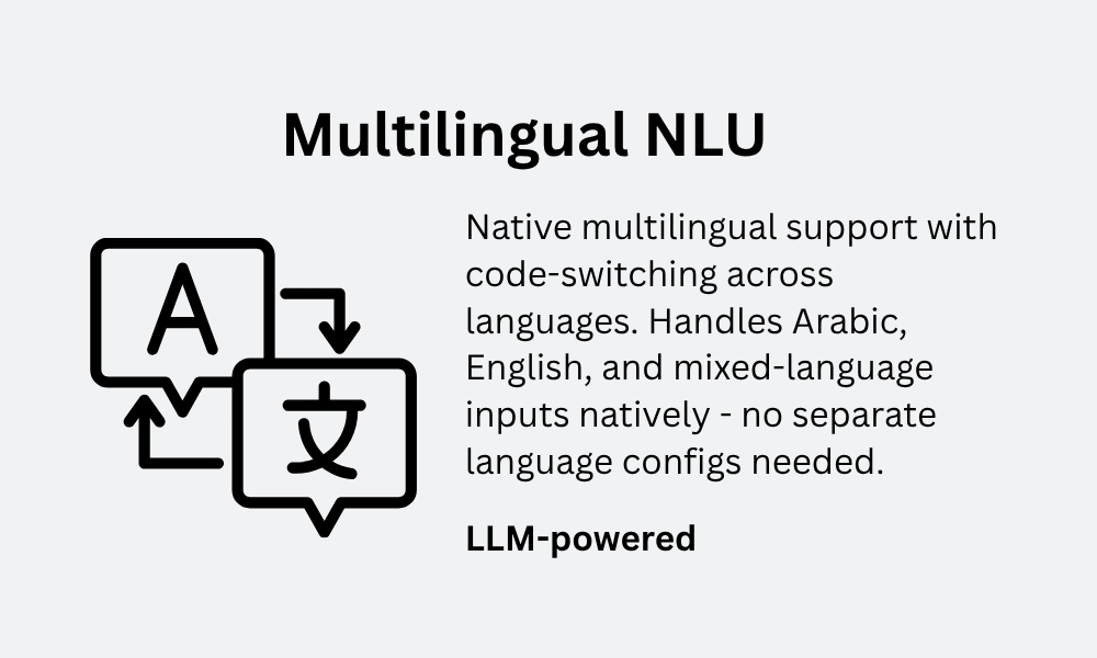 Yes - our automation platform is built for multilingual conversations. The LLM-backed NLU handles multiple languages natively, including Arabic, English, and mixed-language inputs, with no separate language configs needed. Additional language support can be configured based on your customer base and region.