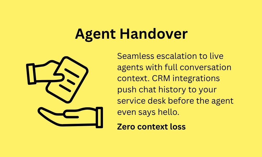 Our platform includes seamless agent handover — the full conversation context, uploaded documents, and customer intent are passed to your live agent platform (Zendesk, Salesforce, or your custom system) before the agent takes over. No customer repeats themselves.