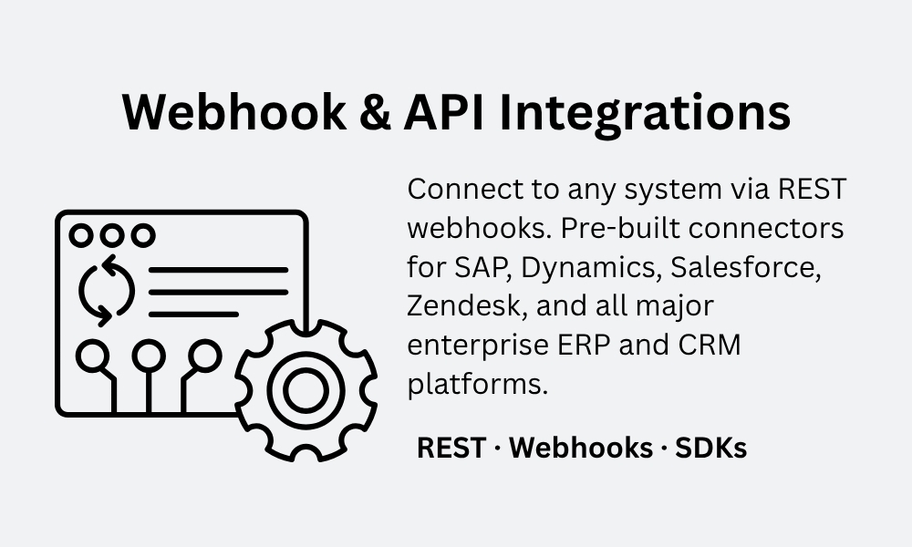 Pre-built integrations with SAP, Microsoft Dynamics, Salesforce, Automation Anywhere, and major ERP and CRM platforms – no custom middleware required.